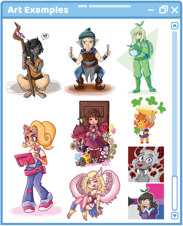 !!Commissions: Open!! (everything listed in full color) Emotes: $20 or 3 for $50 Icons: $25 Chibi: $30 Half Body: $45 Full Body: $60Need design work? Let me take care of it!